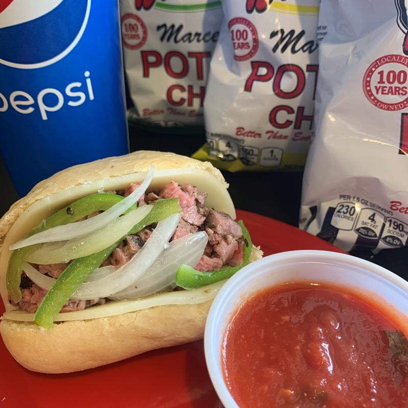 Dive into a delicious Philly Cheese Steak, served with chips and a non-alcoholic drink. Perfect for a filling lunch or dinner