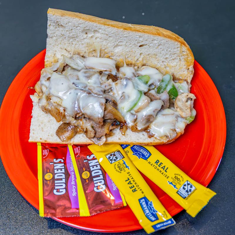 Alfredo sauce, Philly steak, mushrooms, peppers, onions