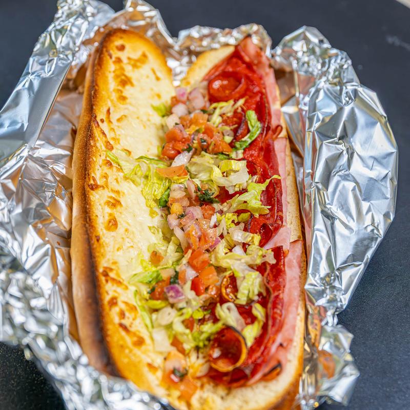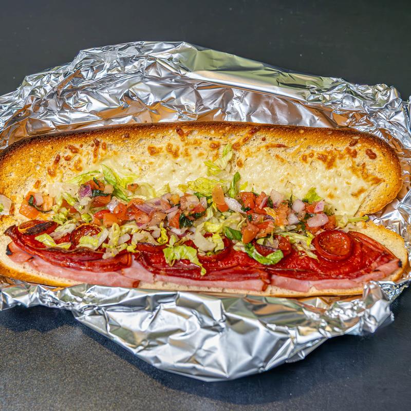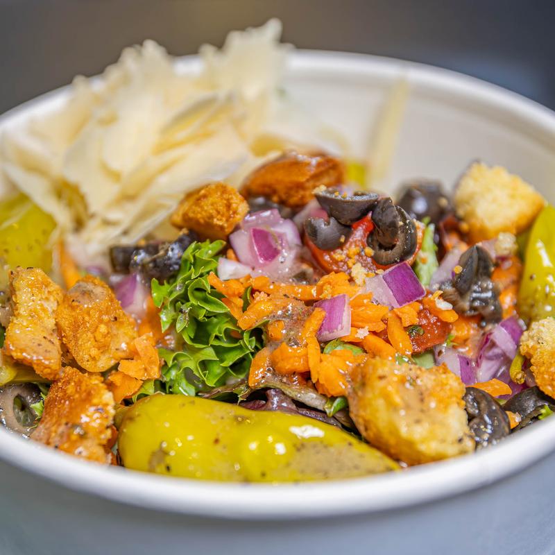 Capicolo ham, hard salami, pepperoni, romaine, mozzarella, brushetta, Italian dressing, red sauce